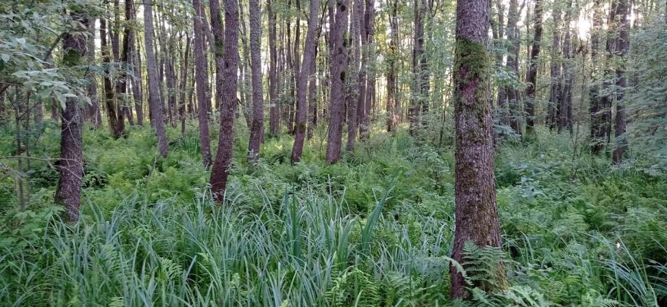 Вокруг посадка заросла кустарниковой растительностью (спирея, сирень, пузыреплодник). Имеются клен, липы, лиственницы возрастом около 60 лет. На полуострове большая площадь зарослей ивы, ольхи черной.